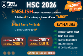 তোমরা যারা HSC 2026 বোর্ড পরীক্ষার জন্য English ভালোভাবে বুঝে প্রস্তুতি নিতে চাও, তাদের জন্যই আমাদের HSC 2026 English Concept to Board Preparation Course (Online)। এই কোর্সে English ১ম ও ২য় পত্র Google Meet–এর মাধ্যমে লাইভ ক্লাসে পড়ানো হয়, যেখানে কনসেপ্ট ক্লিয়ার করে বোর্ড পরীক্ষার প্রশ্নের জন্য ধাপে ধাপে প্রস্তুত করা হয়।